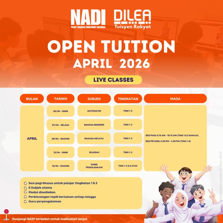 Dilea- Open Tuition (Quarter 2/2026) Subjek : Sejarah Tingkatan 2 & 5 Tarikh : 13/04/2026 Masa : 3.30 pm- 4.30 pm Tempat : NADI Kampung Kamunting